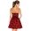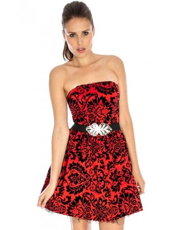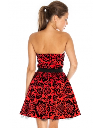 Red, strapless, a-line dress with beautiful black flock print. The dress is boned for extra shape and netted lining for a fuller, dramatic look to the skirt. Comes complete with contrasting belt to help enhance the waistline.