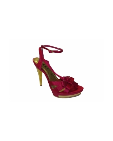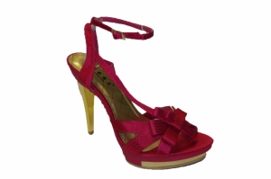 This very beautiful fuchia satin sandal features three straps meeting intricately at the centre, with adorable bow-detail on top. A side strap joins trendy heel and ankle straps. The stunning tapered, gold stiletto high-heel adds a touch of class, while there is intricate detail on the exposed gold platform sole.