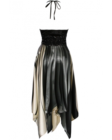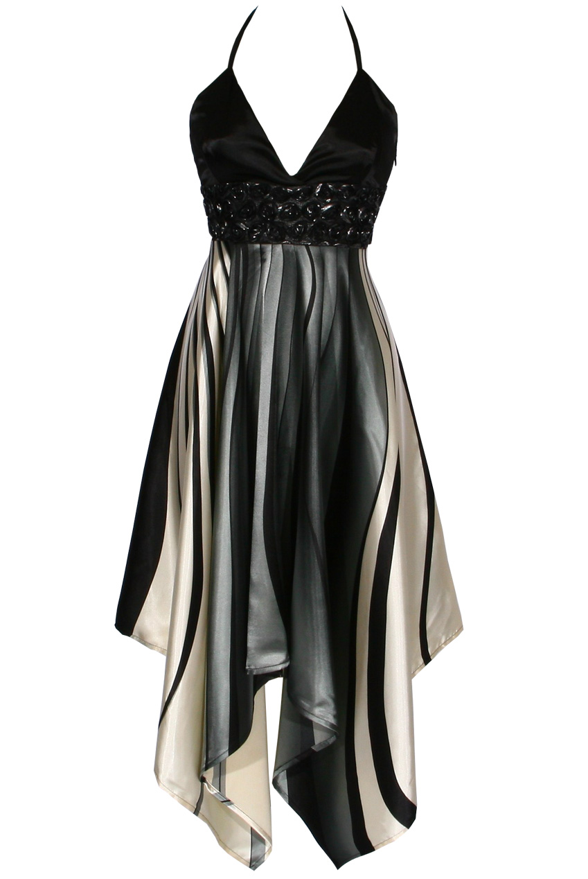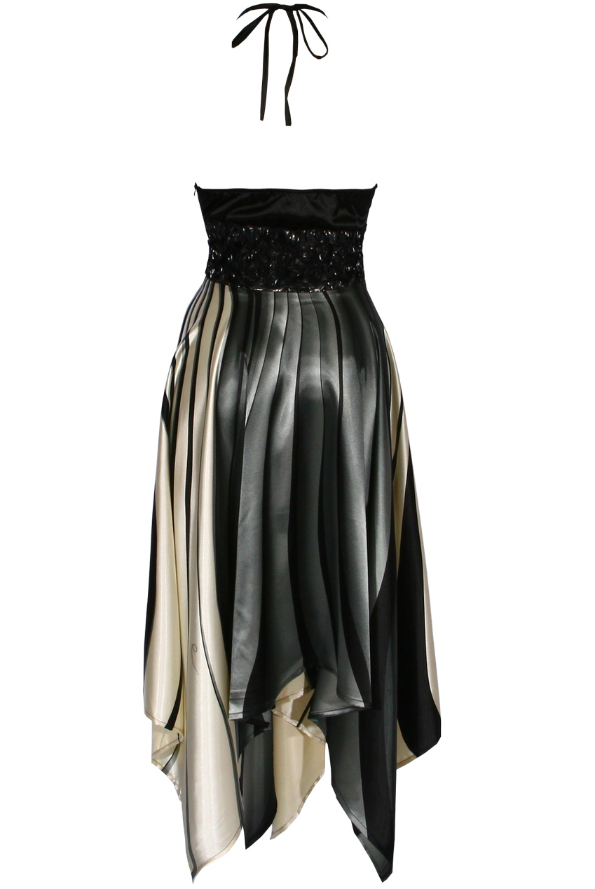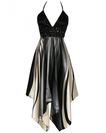 A beautiful party dress for all thoses big occassions. A soft handkerchief, faux satin fabric with white, black and grey print and rose embellishment bust detail.
