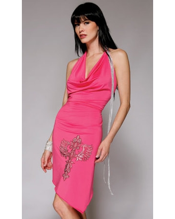 This halter neck dress features a cowl neck with a rhinestone design on the front. The assymetrical hemline cinches at the back with a keyhole at the base of your back, and a hanging chain detail from the neck.