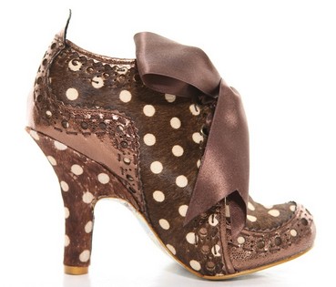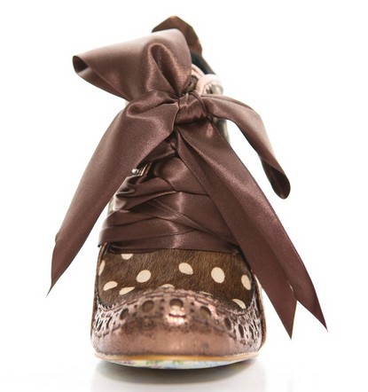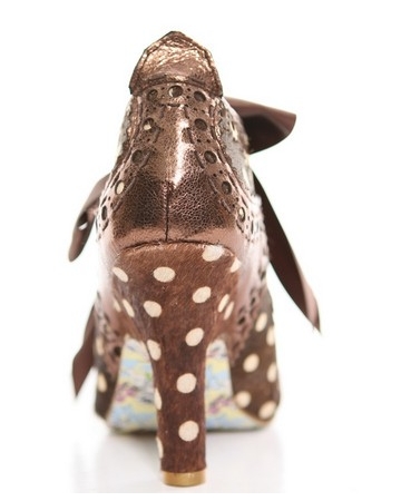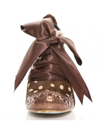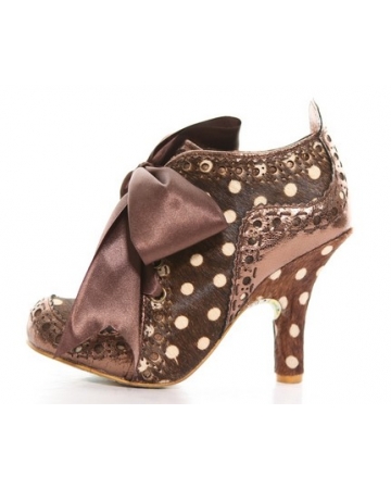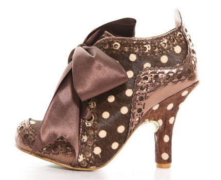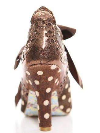 Show off your flamboyant side in these trendy bronze and polka dot print, soft shoe boot featuring shimmering gold metallic effect colour, a wide brown satin bow and pretty 3.75" kitten heel.