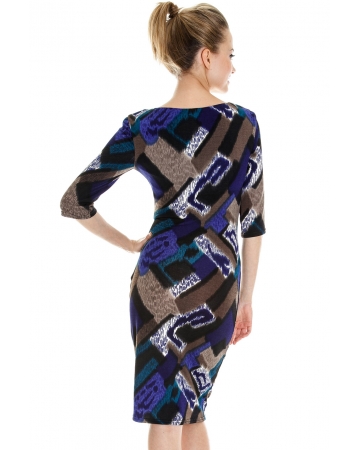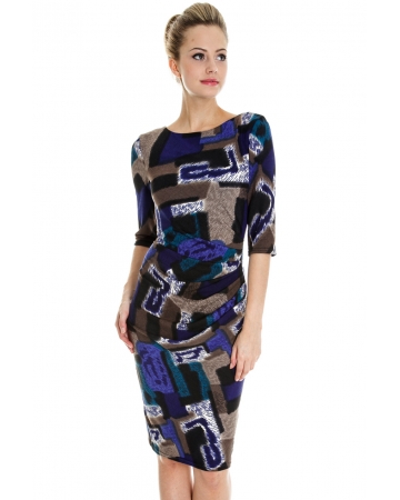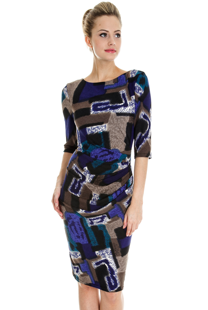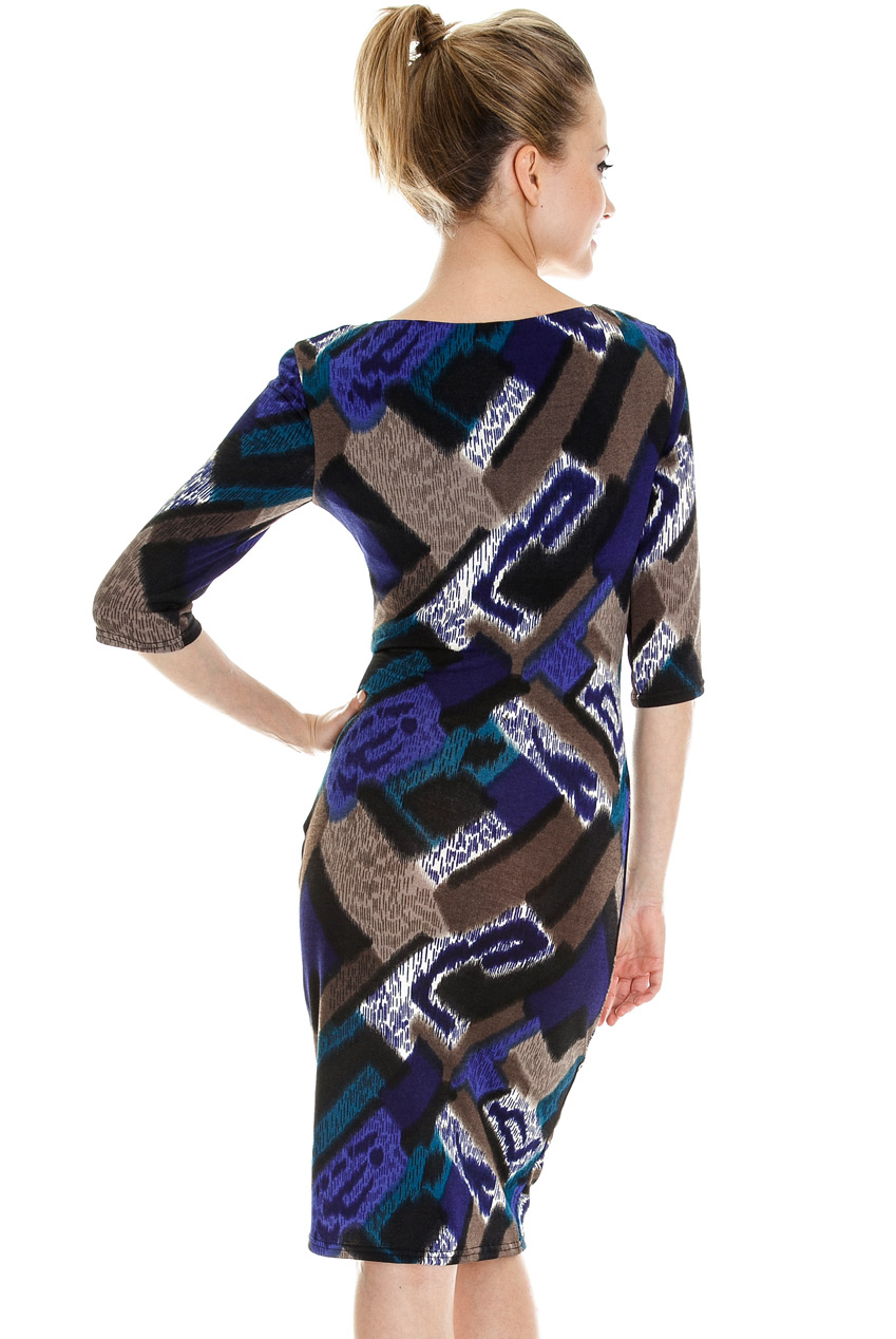 Soft jersey dress with blue, beige, turquoise, black and cream abstract print. Flattering 3/4 length sleeves and tailored fit with ruching detail on the front. Perfect dress for all shapes.
