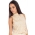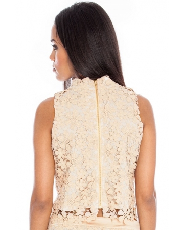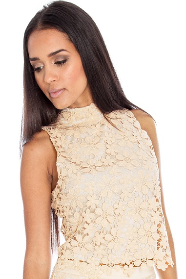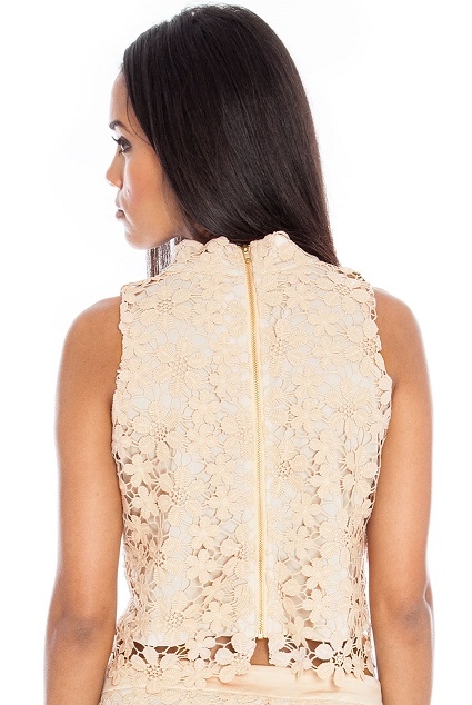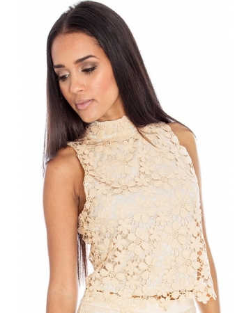 A soft nude, sleeveless top with floral crochet finish, a smart high neck with back zip and a cropped hem length.