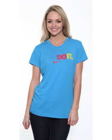 A bright blue, round neck, nike t-shirt with colourful print "Do It" on the front consisting of classic Nike logo and discreet Dri Fit tag to the side.