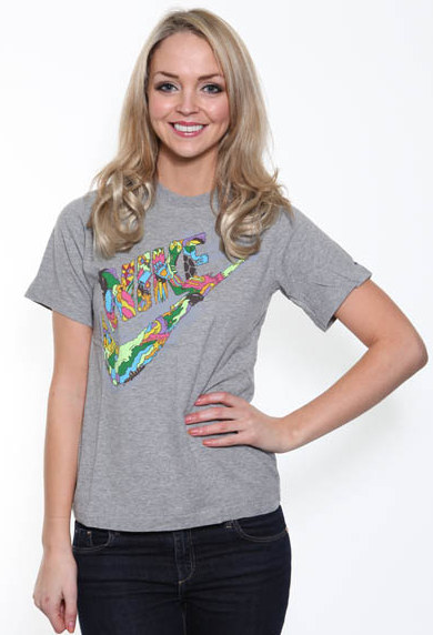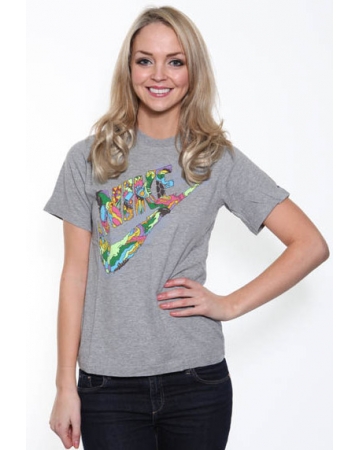 A grey, round neck, nike t-shirt with colourful Nike log print on the front consisting of various sporting images. Also a subtl epurple Nike logo sits on the left sleeve.
