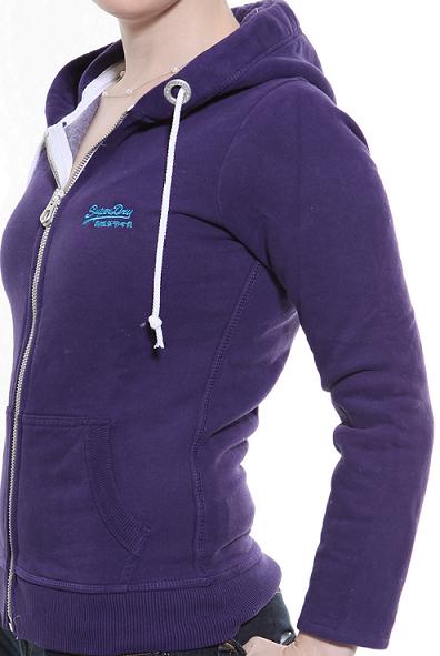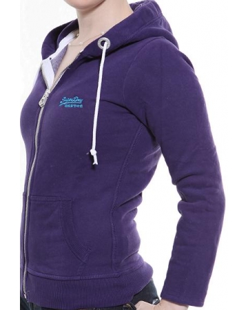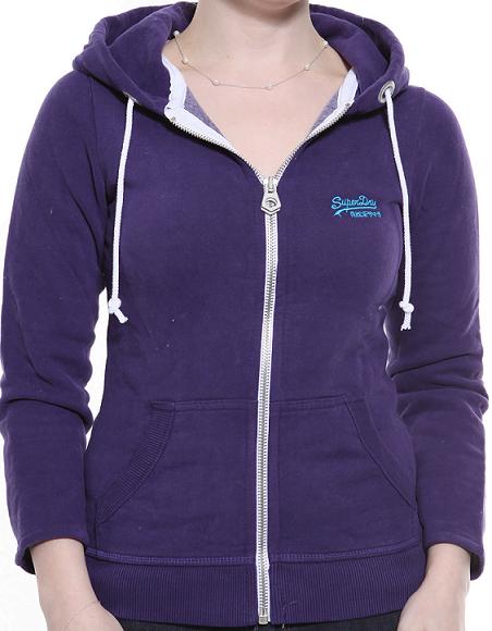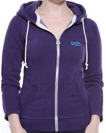 Ladies Superdry, purple zip up hoodie with two side pockets, and classic "Superdry"  chest logo embroided in blue.