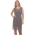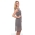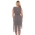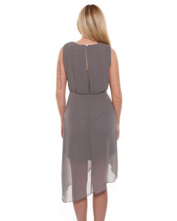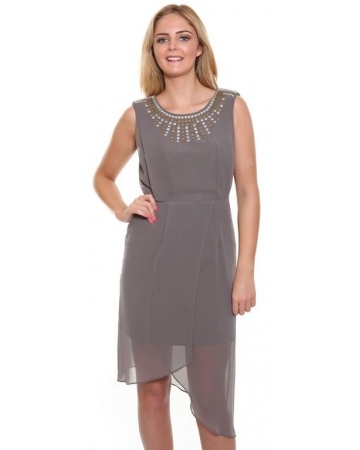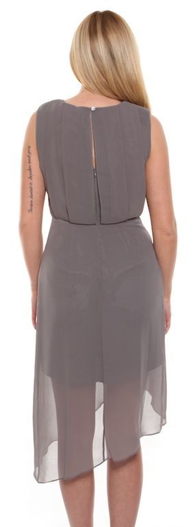A dark shadow grey, chiffon dress with silver and bronze metallic stud detail on the neckline. A cute sleeveless dress with wrap over chiffon skirt, slight padded shoulder straps, zip up and button closure, with keyhole detail on the back and flattering chiffon panels.