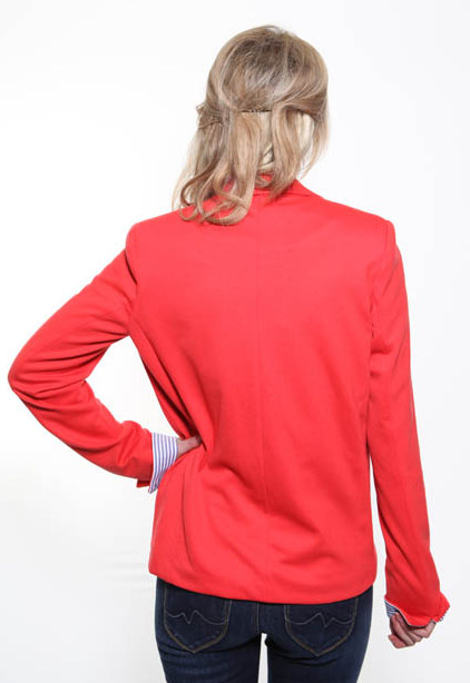 A beautiful crispy red blazer with contrasting blue and white nautical stripe lining with pearl cream trim and turn up cuffs with stripe lining. It has a very flattering shape and is perfect little blazer to wear during those cooler summer evenings.