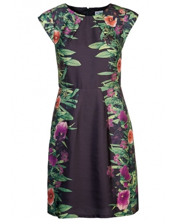 Pretty a-line dress in black with contrasting garden print of bright green leaves with purple and orange flowers. Knee length dress with half capped sleeves and concealed zip up closure to the back.