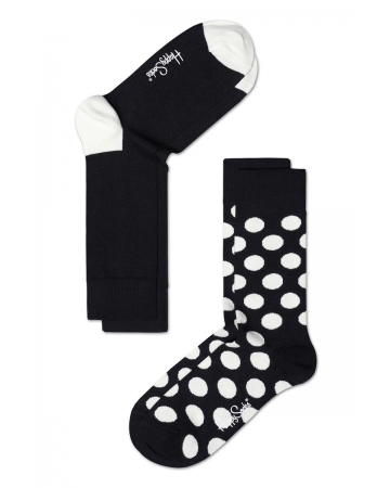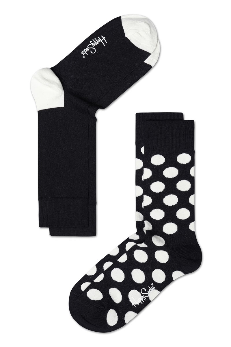 Show your fun side in these Happy Socks. One pair of black socks with large cream polka dot print and a plain pair of black socks with contrasting cream toe and heel. Both pairs of socks have a white Happy Socks logo print on the bottom.