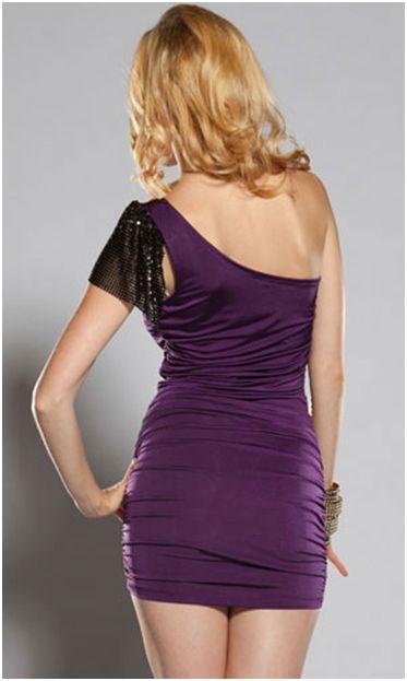 A beautiful purple, sleek one sleeve mini dress with decorative black metal shoulder design.