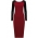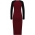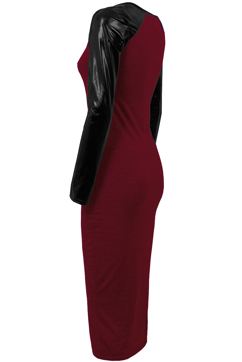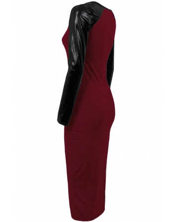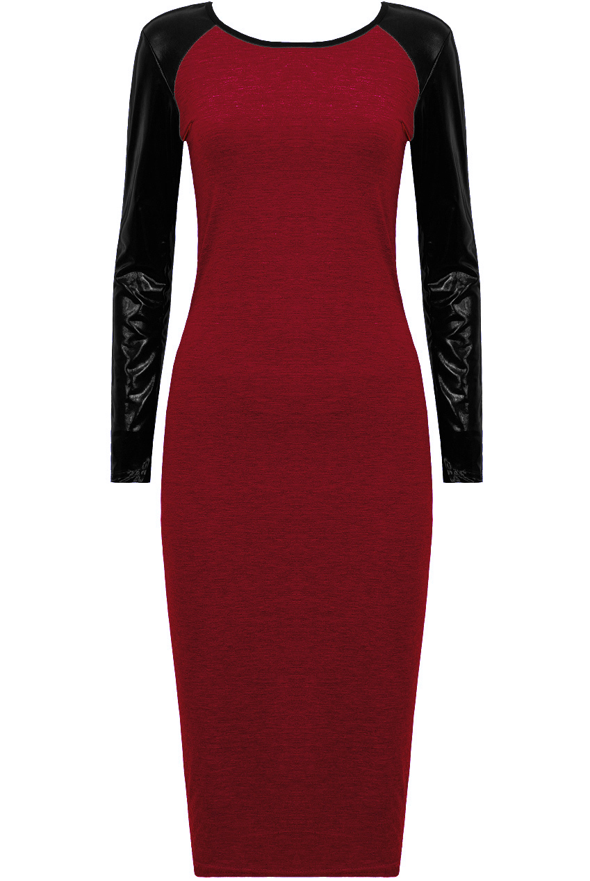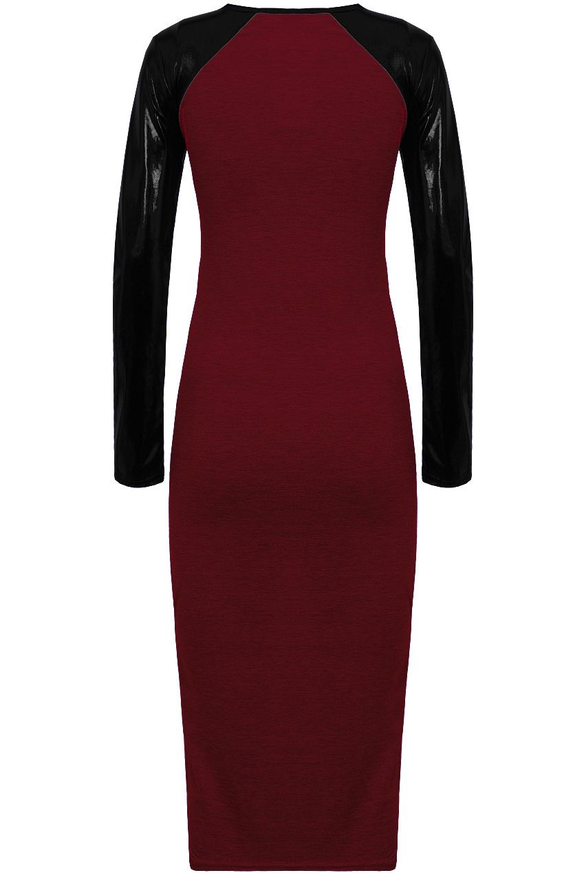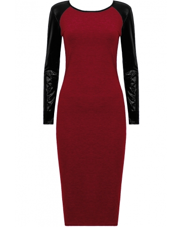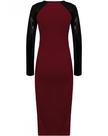 A deep wine midi dress with contrasting long, black, pvc sleeves. Soft, stretchy fabric to fit all sizes and a flattering 42 inch length from shoulder to the hemline.