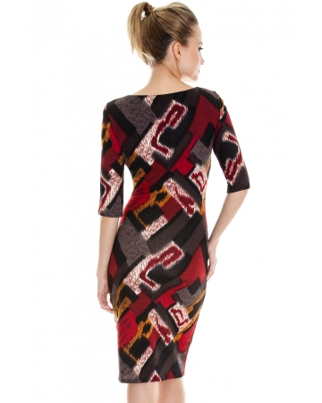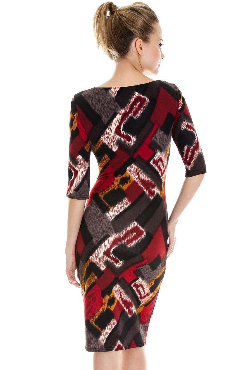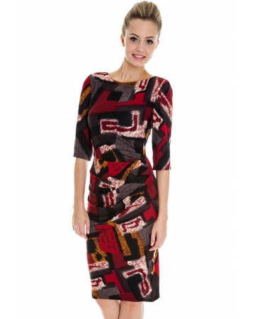 Soft jersey dress with beautiful autumn shades of red, brown, black, cream and grey in an abstract print. Flattering 3/4 length sleeves and tailored fit with ruching detail on the front. Perfect dress for all shapes.
