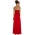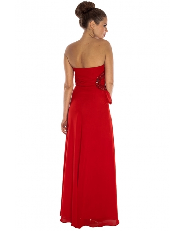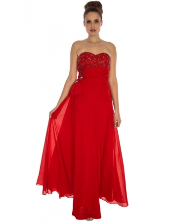 Elegant, ruby red maxi dress with jewelled bodice and a dramatic chiffon skirt. Also features a flattering ruched fabric waist sash and jewelled bow detail to one side.