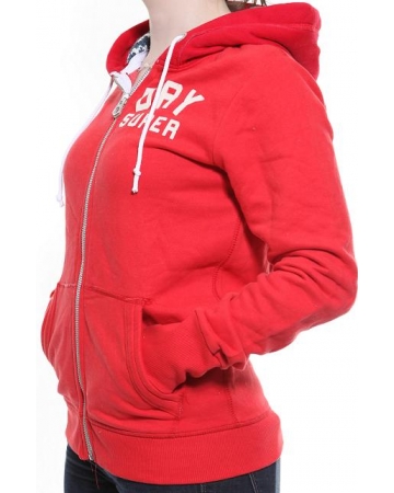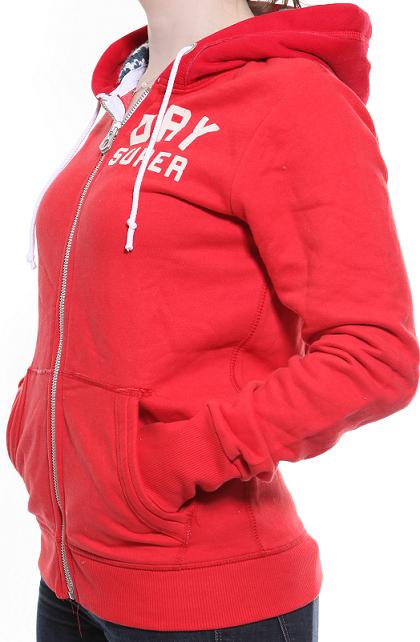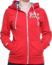 SuperDry red zip up front women's hoodie featuring two side pockets, "SuperDry" logo on chest and navy/white knitted hoodie.