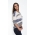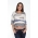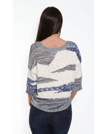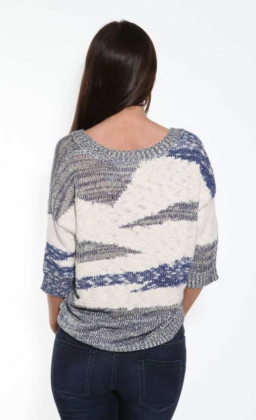 A beautiful navy and cream knitted jumper with abstract print, round neck, flattering dipped hemline to the back and flattering short sleeves. This is a large fitting jumper for a comfortable, casual look.