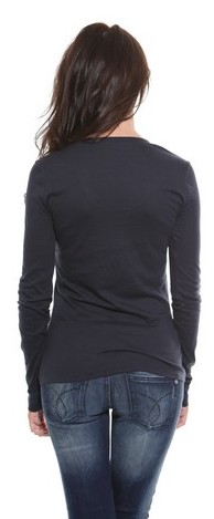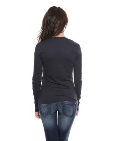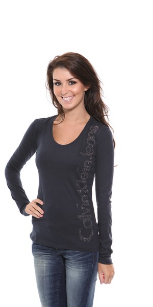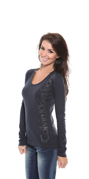 A black, long sleeve ladies t-shirt with flattering scoop neckline and features small diamante "Calvin kelin Jeans" logo down one side.
