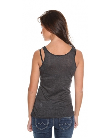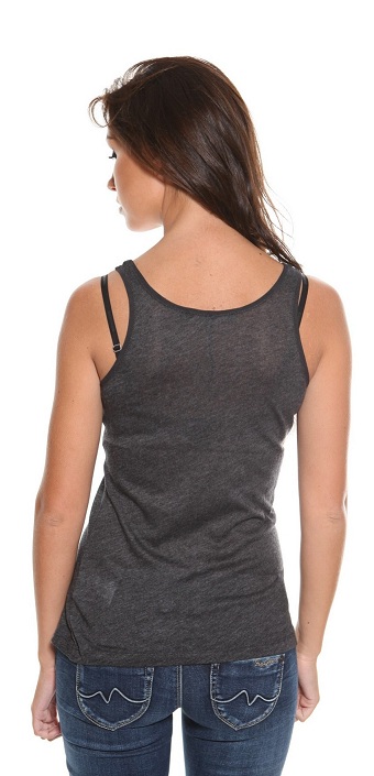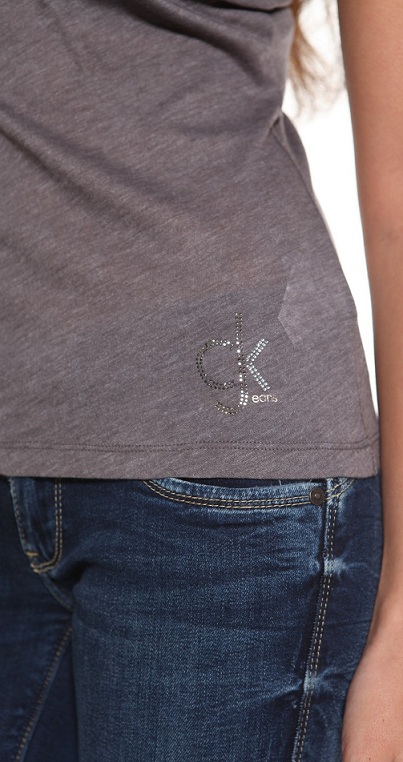 A dark grey, light weight ladies tank top featuring diamante Calvin Klein logo to one side at the bottom.